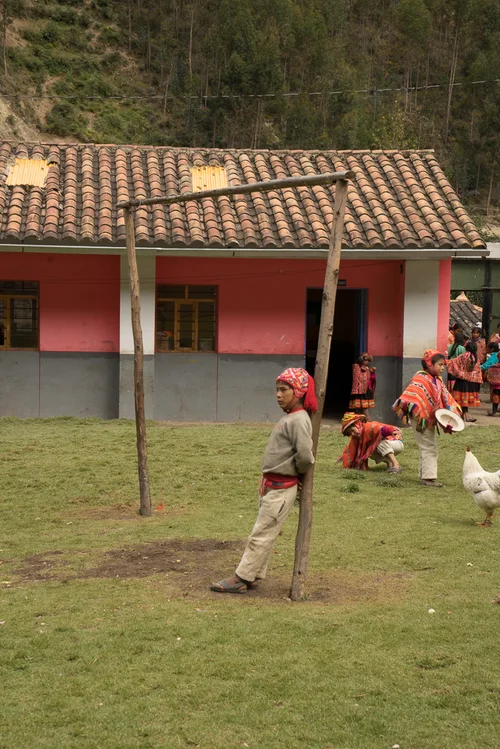 Several miles above Ollantaytambo, where tourists catch the train to Machu Picchu, is the small town of Huilloc. With a group of photographers, I visited the school in 2017. It was a Monday in May, the day after mother’s day, and the students in the 3rd grade class were writing messages. In this school, the students do their studies in the Quechua language until the 5th grade where everything changes to Spanish. These are their daily, not ceremonial, clothes. And in this town, like many others, weaving designs and colors signify to which village or perhaps weaving cooperative a person belongs. These red and black designs signify the Huilloc weaving community, the Huayruros, after the red and black fruit of the Huayaro tree from lowland Amazonian Peru. Together, I am told, the red and black create completeness, and the huayaro seeds have been used since Inca times as amulets to summon riches and luck. This is a school that welcomes visitors, and we were invited to visit classrooms and the recess games of tag and soccer. Note the safe base of the pole; the soccer goal and waiting goalie. Luck and riches indeed.